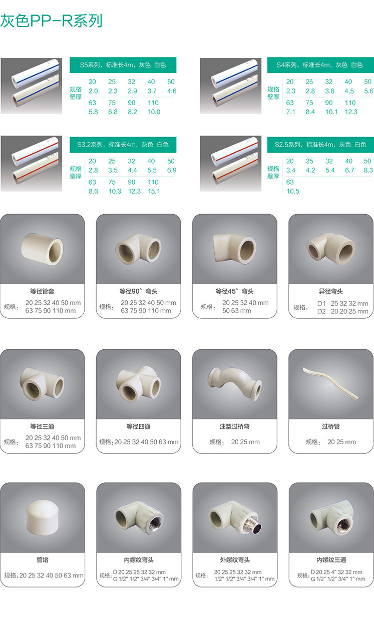 公司采用進(jìn)口PP-R原材料和先進(jìn)的生產(chǎn)工藝,嚴(yán)格按照國(guó)家標(biāo)準(zhǔn)GB/T18742.2/GB/T18742.3-2002設(shè)計(jì)和制造,本產(chǎn)品除具有抗壓力強(qiáng)、耐腐蝕、耐溫性能好、衛(wèi)生性能優(yōu)良等優(yōu)點(diǎn)外,還具有重量輕、運(yùn)輸便利、采用熱熔連接等優(yōu)點(diǎn)。PP-R管道系統(tǒng)在冷熱水輸配水工程中采用熱熔接技術(shù),其綜合技術(shù)性能與經(jīng)濟(jì)指標(biāo)由于鍍鋅管,UPVC管,是歐美發(fā)達(dá)國(guó)家給水管道的主要產(chǎn)品之一。
