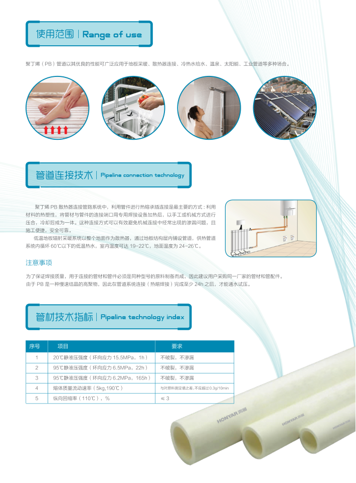 聚丁烯(PB)是一種高分子惰性聚合物,它具有很高的耐溫性、持久性、化學(xué)穩(wěn)定性和可塑性,無(wú)味、無(wú)臭、無(wú)毒,是目前世界上最尖端的化學(xué)材料之一,有“塑料黃金”的美譽(yù)。該材料重量輕,柔韌性好,耐腐蝕,用于壓力管道時(shí)耐高溫特性尤為突出,可在95℃下長(zhǎng)期使用,最高使用溫度可達(dá)110℃。管材表面粗糙度為0.007,不結(jié)垢,無(wú)需作保溫,保護(hù)水質(zhì),使用效果很好。產(chǎn)品的生產(chǎn)與檢驗(yàn)嚴(yán)格執(zhí)行國(guó)家標(biāo)準(zhǔn)GB/T 19473-2004的要求,同時(shí)滿足相關(guān)國(guó)際標(biāo)準(zhǔn)的要求。